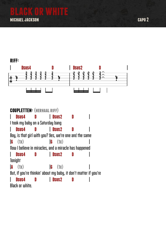 In de video duiken we in het nummer Black or White van Michael Jackson. Een geweldige iconische popsong, met een heerlijke gitaar-riff. In de video leg ik stap voor stap uit wat je moet doen om deze riff goed in de vingers te krijgen zodat jij dit nummer ook kunt leren op gitaar! Hier deel ik de video met je en ook de gratis bladmuziek zodat jij het nummer écht goed kunt leren spelen: