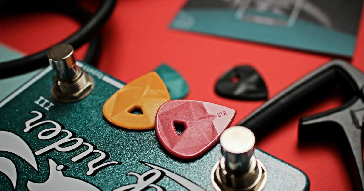 Mijn advies is om plectrums te gebruiken met een dikte van ongeveer 1mm. Dunne plectrums lijken misschien handig voor slagjes, maar je kunt beter je plectrumtechniek (ook met slag) leren beheersen met een dik plectrum zodat je volume doseert met je techniek in plaats van met een dun plectrum te spelen.